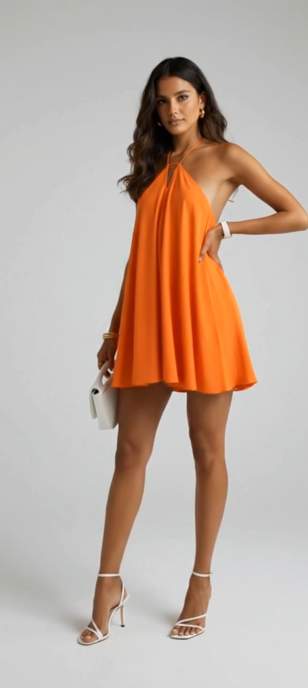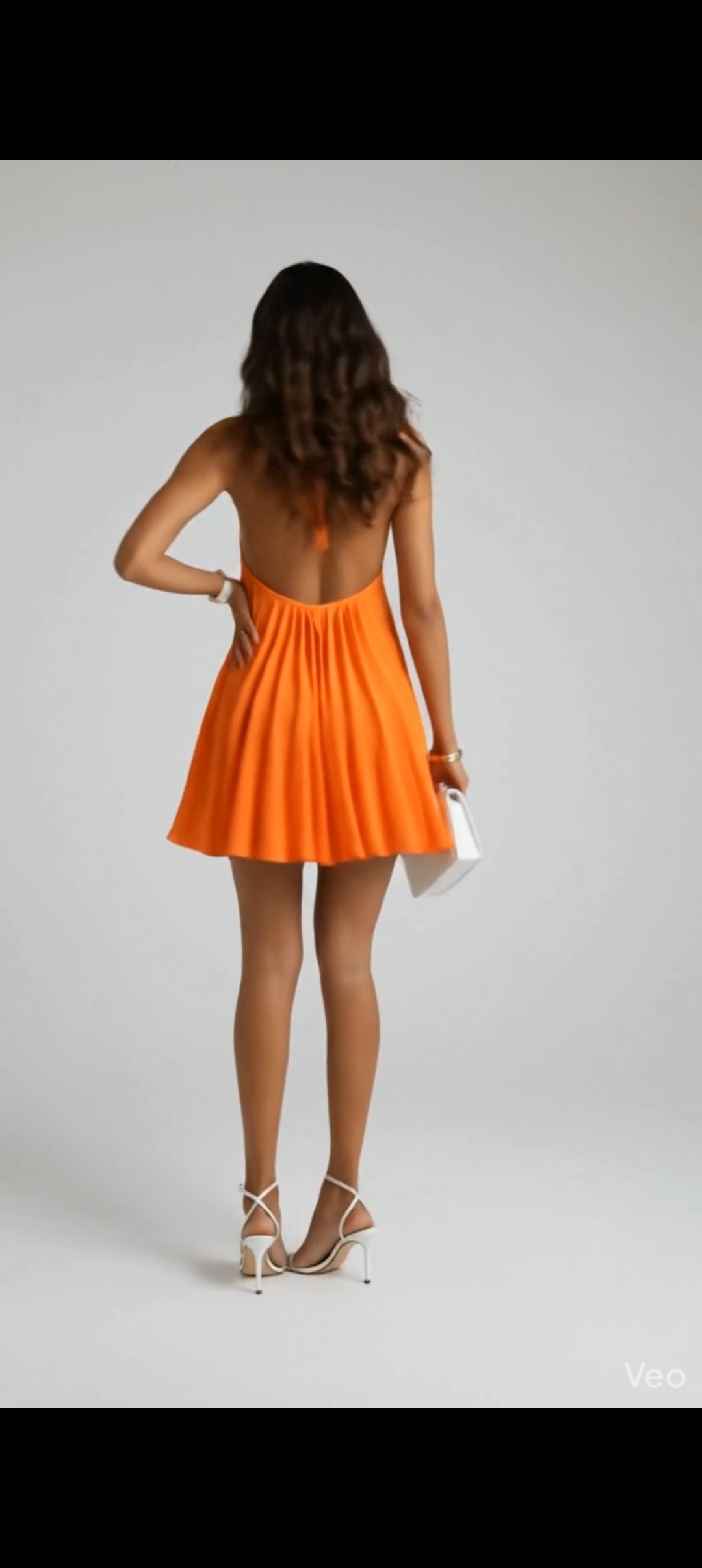Luxury mini dress, halter neck dress, orange satin dress, resort wear women, summer party dress, Mynway luxury wear, minimal evening dress, vacation outfit women, A-line mini dress, chic brunch dress, modern luxury fashion