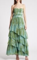 - Silhouette: Strapless + tiered cascade skirt