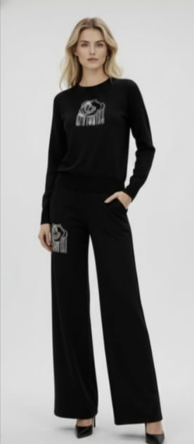 Luxury black co-ord set, women designer co-ords, premium knit lounge set, Mynway luxury wear, rose motif co-ord, minimalist women outfit, wide leg co-ord pants, aesthetic airport outfit, modern luxury clothing, elegant casual wear, women matching set