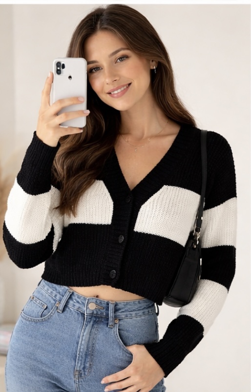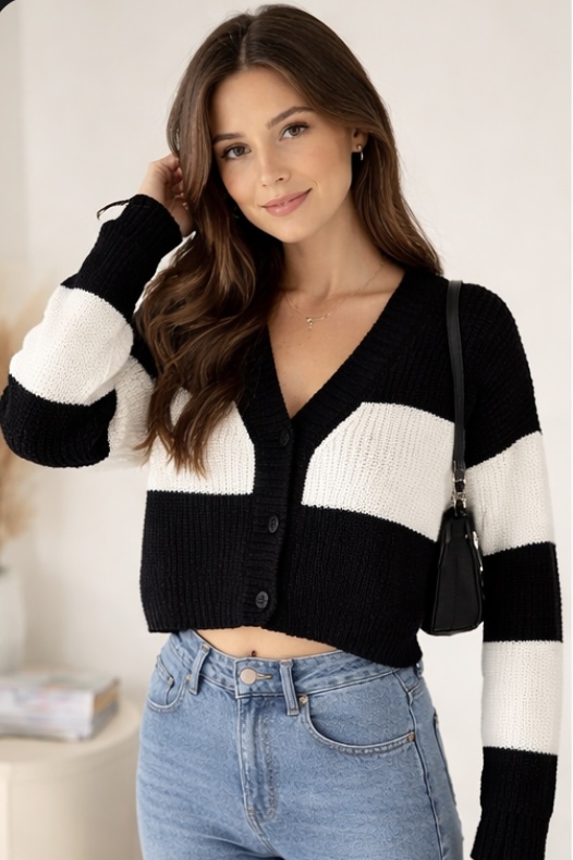 Luxury knit cardigan, cropped cardigan women, black white knit top, Mynway women wear, premium cardigan top, chic cropped sweater, brunch outfit women, Instagram fashion top, minimalist knitwear, modern women cardigan