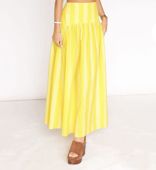 Bright, breezy, and effortlessly elegant—this sunbeam striped maxi skirt is designed for warm days and carefree movement. The high-waist yoke flatters the figure while soft gathers create beautiful volume and flow. Finished with cheerful yellow stripes, it’s perfect for styling with crisp white tops or relaxed camisoles for an elevated summer look.