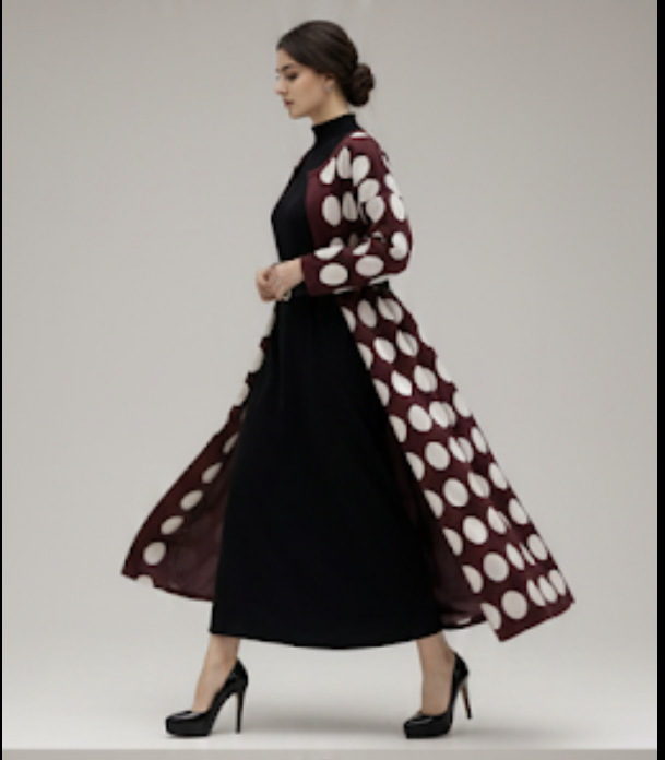 The Midnight Polka Overlay Dress blends timeless elegance with modern drama. A sleek black inner dress is elevated by a flowing polka-patterned overlay that moves beautifully with every step. Style it with heels and minimal jewellery for a powerful, graceful look that feels confident, artistic, and effortlessly luxurious.