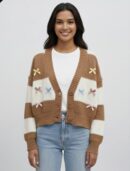 Brown knit cardigan women, mocha cardigan top, bow detail knitwear, Mynway luxury cardigan, cropped cardigan women, aesthetic winter knit, neutral tone cardigan, Pinterest fashion knit, premium women cardigan, striped knit top