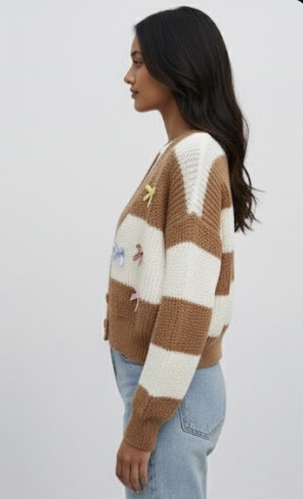 Warm, cozy, and effortlessly refined — the Mocha Bow Stripe Knit Cardigan brings understated luxury to everyday styling. The rich mocha and ivory stripes paired with delicate bow accents create a soft statement that feels timeless yet modern. Style it with denim or neutral trousers for a polished, cozy-chic look.