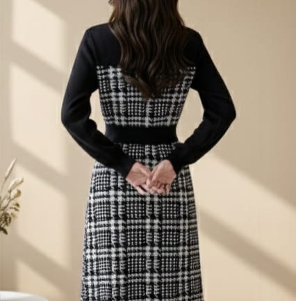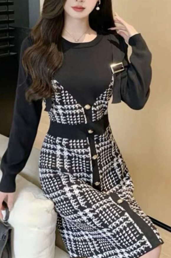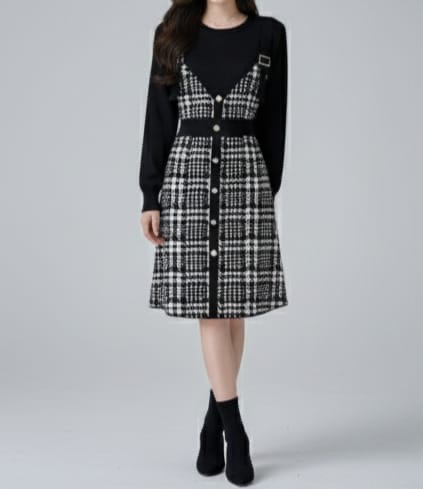 A Parisian-inspired dress crafted in luxe tweed with a layered pinafore look. The fitted waistline and button-down detailing create a flattering silhouette, while the knit top ensures comfort throughout the day. Ideal for work settings, brunch moments or chic evenings. Style with ankle boots or heels for an effortlessly polished vibe.