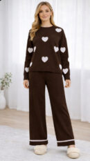 Luxury knit lounge set, heart print co ord set, women brown lounge wear, premium knit co ord set, aesthetic winter lounge set, soft knit women outfit, Mynway luxury clothing, cozy chic lounge wear, stylish knit set for women, Instagram aesthetic co ord set, modern women knitwear