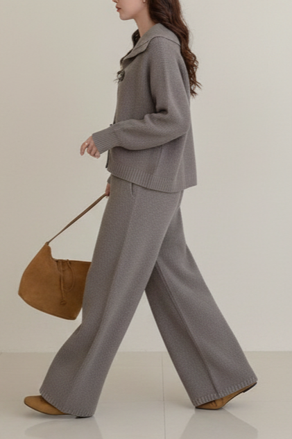Luxury knit co-ord set, women knitwear co ord, premium lounge set women, taupe co ord set, cardigan co ord set, Mynway co ords, minimalist luxury outfit, airport look co ord, ribbed knit set women, aesthetic co ord outfit
