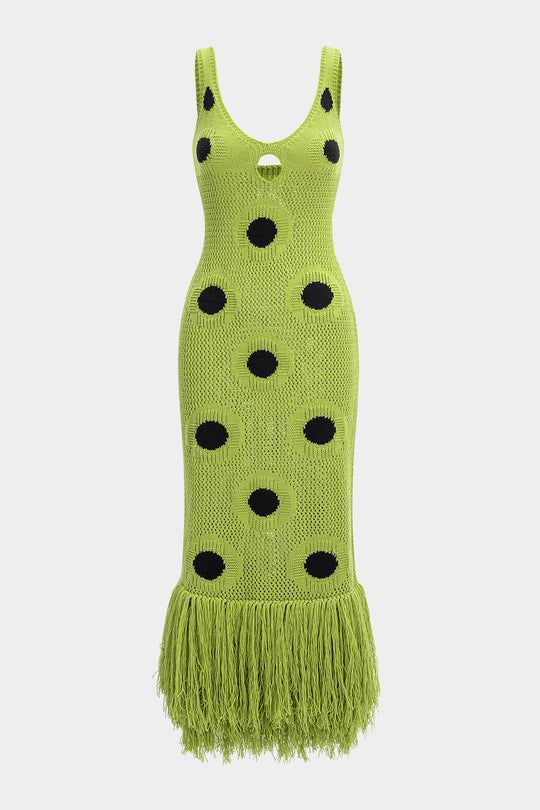 A statement piece for the woman who arrives to be remembered. The Verde Crochet Fringe Maxi blends meticulous craftsmanship with a daring silhouette that flatters every curve. The contrast circular knitwork and flowing fringe hem create movement that feels artistic and effortless. Style with metallic heels and minimal jewelry for an elevated, editorial-ready look.