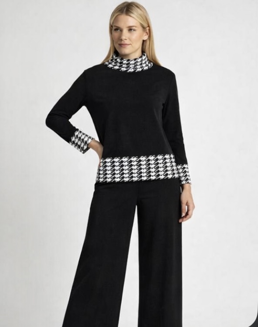 • Black base with contrast houndstooth accents