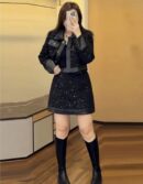 Turn every entrance into a moment with the **Noir Stardust Mini Dress Set**. Designed with delicate sparkle detailing and a sharp cropped jacket, this set blends glamour with modern edge. Style it with knee-high boots or heels for an effortlessly bold, high-fashion look that radiates confidence and night-time luxury.