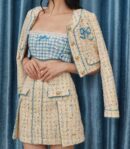 Step into luxe elegance with this Tweed Pastel Three-Piece Co-Ord Set, crafted in soft yellow tweed with turquoise detailing. The structured mini jacket, buttoned skirt, and smocked gingham bustier come together to create a chic, high-fashion look. A refined yet playful ensemble perfect for statement-making days and elevated outings.