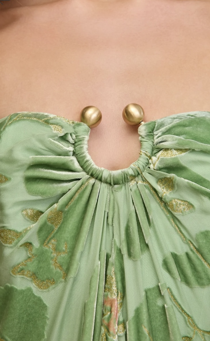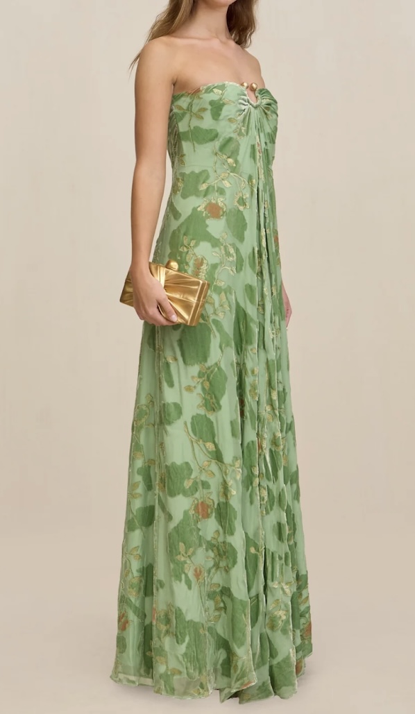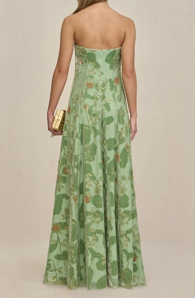 sage floral maxi dress, resort wear dress, summer cut-out dress, vacation maxi gown, boho green dress, flowy chiffon maxi, botanical print dress, destination wedding outfit, aesthetic summer dress, Mynway luxury wear, breezy green maxi