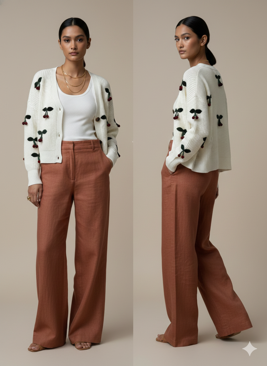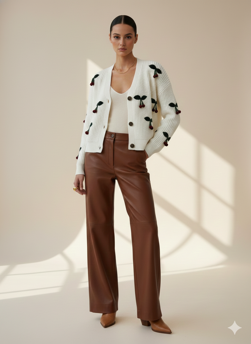 Indulge in the whimsical luxury of the Cherry Luxe Cardigan. This iconic knit, crafted from a sumptuously soft cashmere-blend, features bold, handcrafted 3D cherry appliqués for a playful yet sophisticated edge. Embrace the effortless cool of this viral-worthy piece that promises comfort without compromising high-end style. It’s more than a cardigan; it’s a mood.