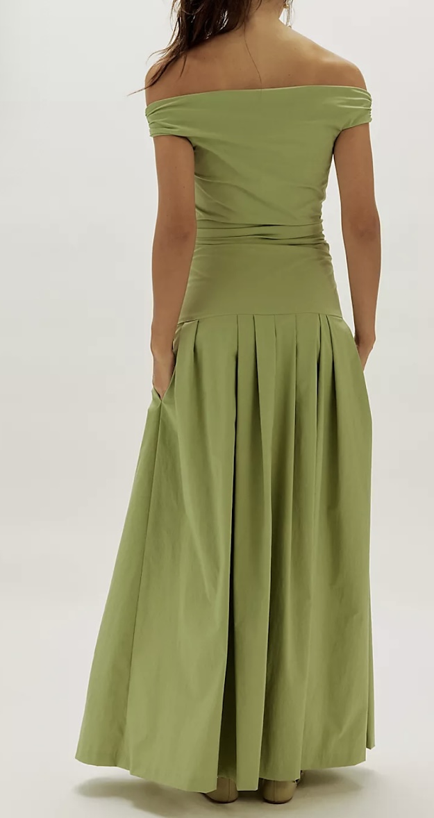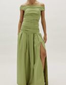 olive green maxi dress, off shoulder evening gown, ruched bodice dress, luxury green dress,