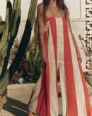 striped jumpsuit women, resort wear jumpsuit, linen wide-leg jumpsuit, strapless vacation outfit, luxury summer jumpsuit, aesthetic resort outfit, beach dinner style, Mynway jumpsuit, vertical stripe jumpsuit, trendy holiday wear, chic wide-leg jumpsuit, statement summer clothing